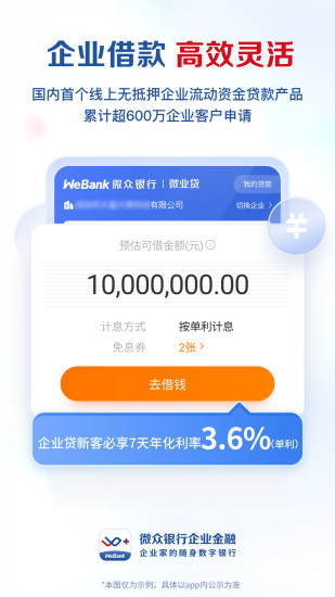 關于我們:微眾銀行是領先的數字銀行,以“讓金融普惠大眾為使命”,以科技為發展驅動力,專注為中小微企業和普羅大眾提供更為優質、便捷的金融服務。 這里有: 1、貸款: 微業貸--為企業及個體工商戶提供線上流動資金及個人經營貸款服務,企業貸最高額度1000萬元,個人經營貸最高額度50萬元,企業貸新客必享7天年化利率3.6%(單利),可分24期還款,最快1分鐘到賬,年化利率(單利):2.88%-18%,限首借客戶,非首借客戶具體利率以實際審批為準 2、貼現:微閃貼--為企業提供電子銀行承兌匯票全線上便捷貼現服務,全線上操作,貼現資金最快10秒鐘到賬,且支持可拆分票據 3、保險:我行代銷企業保險、員工保險,幫助中小微企業構建全面的風險保障 4、理財:為企業提供精選代銷理財產品,滿足企業日常閑置資金管理需求,產品購買便捷、申贖靈活 5、賬戶:賬戶管理、資金管理場景、打造更便捷、更靈活、更優惠的企業賬戶 6、微創投:面向企業的線上投融資信息綜合服務平臺,免費查詢投融資信息、行業洞察、技術趨勢 優勢: 1、安全可靠:銀行金融牌照 2、企業開戶:線上預約開戶服務,智能填單實時審核,企業省時省力,賬戶最快當天可用 3、金融科技:提供 24h 實時風險監測及攔截服務,運用多層次、多維度的反欺詐檢測技術,結合人臉識別、FIDO+等認證手段,提前預測風險,保障資金安全 4、企業賬戶移動辦公:通過微眾銀行企業金融APP,提供賬戶查詢、轉賬支付、借還款、業務咨詢等金融服務 5、管理靈活:可設置負責人、管理員、操作員、查詢員等角色代您管理 6、銀企對賬:線上按月對賬,提供賬單查詢、交易明細自動發送至郵箱等服務對賬更加輕松便捷 [貼心服務隨時享] 官方電話:95384 --溫馨提示-- 貸款有風險,借款需謹慎;本產品按單利計息,貸款額度、放款時間、利率等以實際審批為準,請根據企業能力合理貸款。(企業貸新客年化利率3.6%優惠7天,需要借款時使用“前7天3.6%定價優惠券”方可享有;具體可享額度以系統頁面展示為準,需核額成功后顯示借款人為企業。個人經營貸不享受此優惠) 歷史業績僅供參考,理財有風險,入市需謹慎。